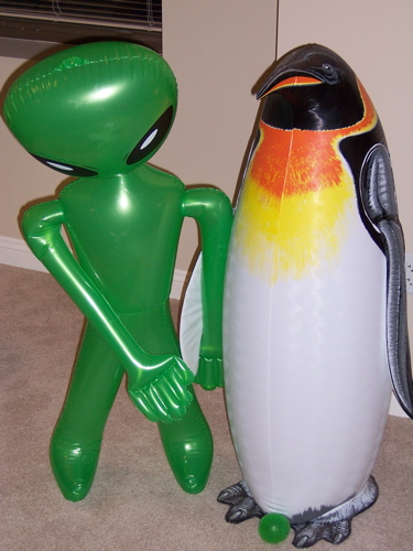 The penguin and the alien are thrilled to announce the arrival of an egg! The alien chick should hatch around September. They hope the baby will have the penguin's fashion sense and the alien's love of travel.