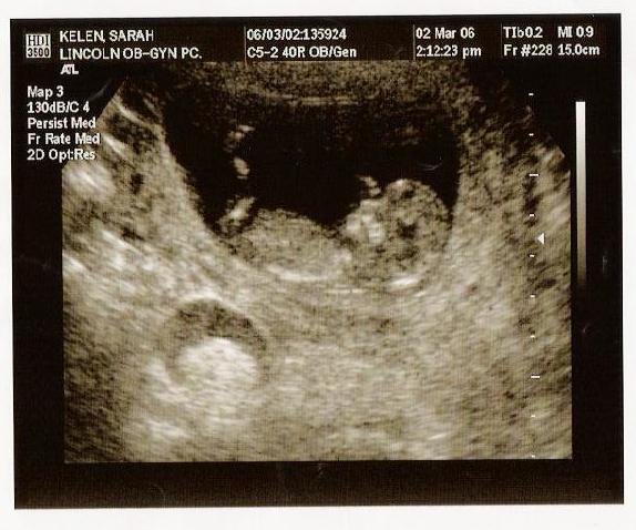 Sarah and Ken will also be having a baby in September. So far it's hard to tell which one of them the baby looks like, but it sure looks cute to them. (Can't tell what you're looking at? The head is on the right; it's waving and kicking a leg.)